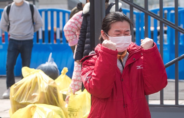 Một bệnh nhân được điều trị khỏi COVID-19 xúc động khi rời bệnh viện dã chiến ở Vũ Hán, tỉnh Hồ Bắc, Trung Quốc, ngày 8/3/2020, trước khi bệnh viện này đóng cửa. (Ảnh: THX/TTXVN)